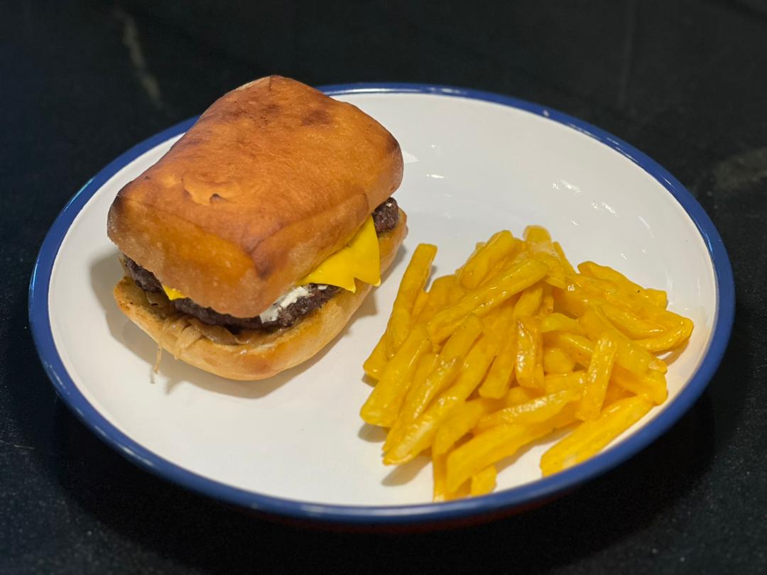 یک عدد برگر دست ساز مخلوط گوشت گوساله و گوسفندی 180 گرمی، کره، پنیر گودا، پیاز، كاراملی، نان مینی چاباتا