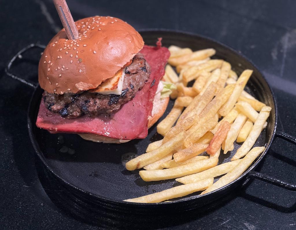 یک عدد برگر دست ساز مخلوط گوشت گوساله و گوسفندی 180 گرمی، چهار ورق بیکن گوشت 90%، پنیر کبابی، سس خردل و مایونز، گوجه، کاهو، نان مک، همراه با سیب زمینی سرخ شده