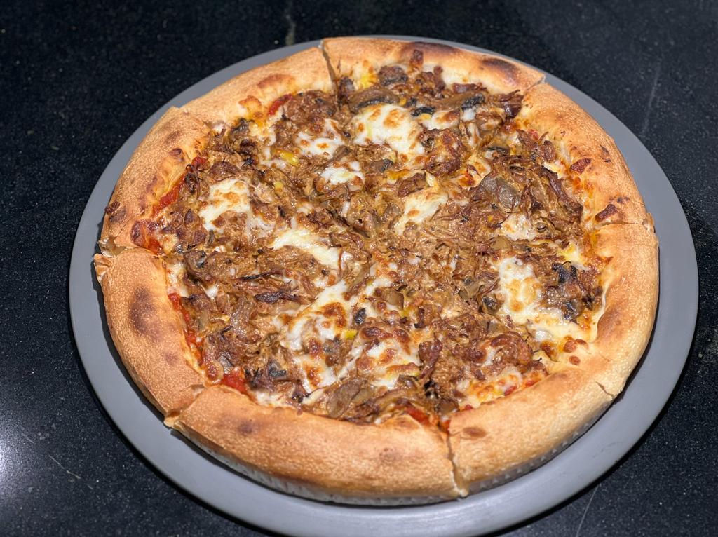 خمیر پیتزا کلاسیک+ گوشت گوساله رست بیف+ قارچ، پیاز+ خامه+ سس مارینارا+ پنیر پیتزا+ پنیر توپی